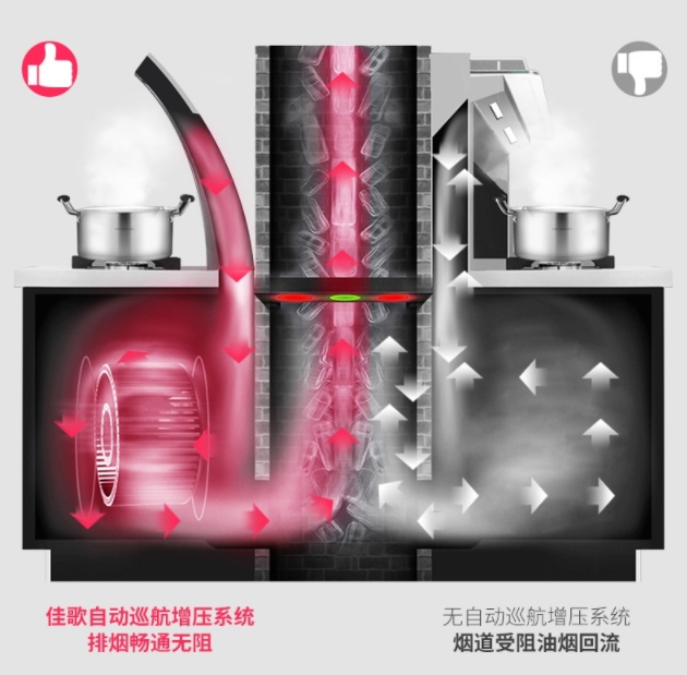 除此之外,佳歌集成灶還采用自動巡航增壓科技,通過檢測和增壓的實(shí)時(shí)聯(lián)動,保證自己的煙機(jī)排風(fēng)壓高于公共煙道以及別人的排風(fēng)壓。超過420pa的排風(fēng)壓遠(yuǎn)高于公共煙道內(nèi)的高峰風(fēng)壓,確保順暢排煙。