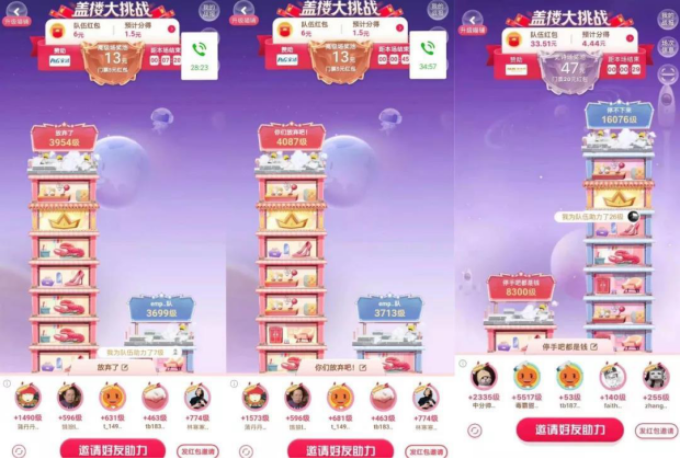 接著就開始了漫長的蓋樓任務(wù),按照兩隊(duì)的隊(duì)伍高樓總等級(jí)高低來衡量勝負(fù),獲勝隊(duì)伍可瓜分本場隊(duì)伍紅包。隊(duì)伍的高樓總等級(jí)可通過隊(duì)員上線助力、拉人助力等方式提升。