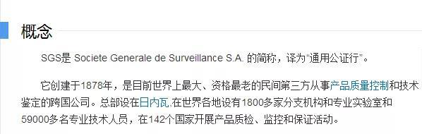 SGS創(chuàng)建于1878年,是目前世界上最大、資格最老的民間第三方從事產(chǎn)品質(zhì)量控制和技術(shù)鑒定的跨國(guó)公司??偛吭O(shè)在日內(nèi)瓦,在世界各地設(shè)有1800多家分支機(jī)構(gòu)和專業(yè)實(shí)驗(yàn)室和 59000多名專業(yè)技術(shù)人員,在142個(gè)國(guó)家開(kāi)展產(chǎn)品質(zhì)檢、監(jiān)控和保證活動(dòng)。所以,從權(quán)威性這個(gè)角度,SGS完全值得信賴。
