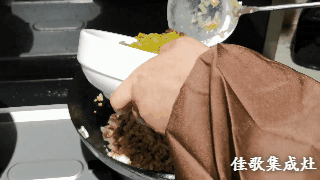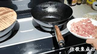 2. 打開佳歌集成灶至大火模式,將豬板油下到熱鍋,煎出豬油備用。佳歌集成灶每分鐘21立方增壓吸力,寬屏攏煙瞬吸即凈,煎炸爆炒無(wú)油煙。