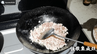 4. 豬肉丁翻炒至半熟,加醬油調(diào)味,加料酒去腥提香。