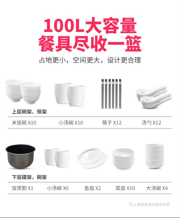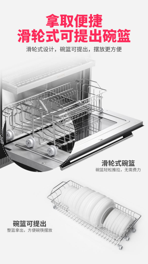 佳歌集成灶W1的100L超大容量一門式消毒柜,突破了雙門式消毒柜的高度限制,讓上下碗籃合為一體,整個內(nèi)腔都可放置碗盤,毫不擁擠!