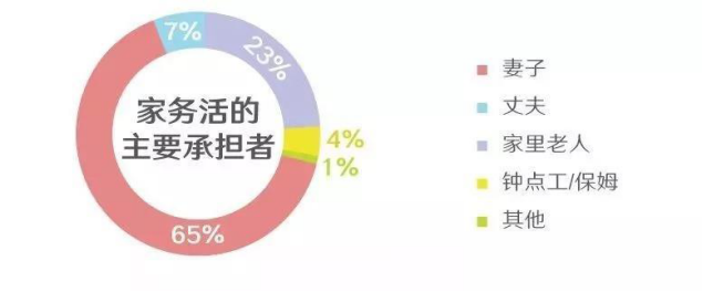 據社會科學文獻出版社發(fā)布的《中國女性生活狀況報告(2017)》顯示:中國女性每天的家務勞動時間達到2.6小時;妻子以65%的壓倒性占比成為家務活的主要承擔者。